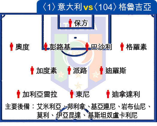 相比起英格蘭,同列B組的意大利及法國,出線形勢更為不妙;兩軍一心以為可攜手出線,殊不知蘇格蘭異軍突起,更進佔榜首,令這兩支應屆世界盃冠亞軍球隊甚為狼狽。意大利4奪世界盃後,面對青黃不接問題,新帥鄧納東尼引入的4-3-3陣式,就好像為東尼度身而設,以高中鋒配合兩位輔鋒攻堅;可是東尼自3月為意軍主場擊敗蘇格蘭後,已因傷未嘗再為國家隊在外圍賽上陣,可幸此子終於擺脫傷患,以他連續6仗為拜仁取得入球威勢,今主場撲擊世界排名104位的格魯吉亞,相信球迷大有機會看他的招牌聽電話慶祝姿勢。