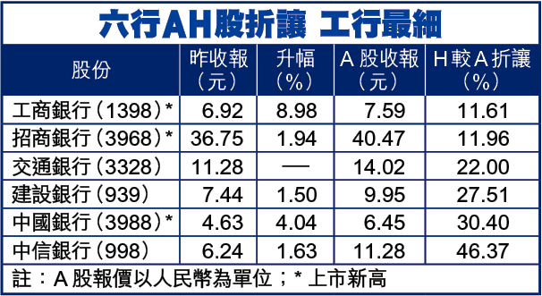 繼交行(3328)前日暴漲逾一成後,工行昨接力追落後,股價飆0.57元至6.92元新高,超越招行(3968),成為六行中A、H股折讓最小股份。中行H股亦破頂漲4%,創新高,惟仍較A股折讓三成。建行則升1.5%至7.44元,較A股報9.95元人民幣,折讓約27.5%。