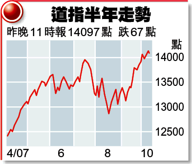 道指昨日早段回落最多72點或0.51%,報14091點;科技股相對穩定,納斯達克綜合指數曾升3點,見2807點的六年半高峯。聯儲局透過隔夜回購協議,向銀行體系注資160億美元(約1248億港元)。開市後個半小時(本港昨晚11時),道指跌67點,報14097點;納指跌0.5點,報2803點。