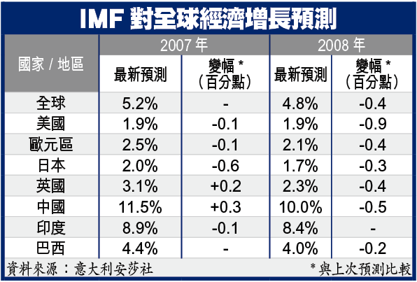 意大利安莎社引述國基會初版文本報道,國基會將於下星期發表的《全球經濟展望報告》中,大幅調低美國明年的經濟增長預測,由2.8%下調至1.9%;歐元區及日本的增長預測則分別被溫和調低0.4及0.3個百分點,至2.1%及1.7%(見表)。近日金融市場動盪,令通脹升溫的機率大減,預測歐洲央行短期內不會加息。