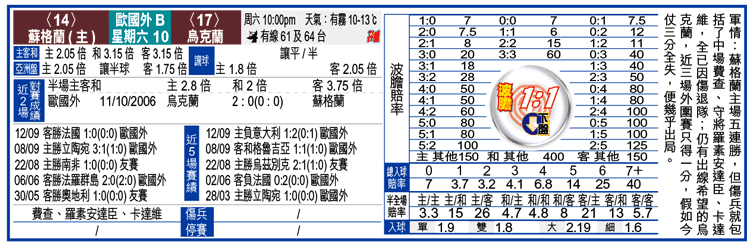 周六歐國外「死亡B組」,蘇格蘭被小覷時屢創驚喜,相反今仗主場迎擊烏克蘭被看好讓平/半,反而不利,一於捧下盤。(球賽編號:星期六10;有線61及64台今日10:00pm直播)