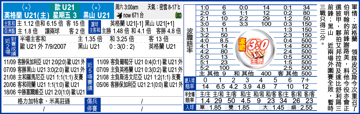 英格蘭是役單W只得1.12倍,而[-1]的「主勝」亦僅得1.48倍,可見被莊家極為看好。若嫌「主勝」賠率不夠分頭,則不妨向英格蘭零失球的波膽埋手,因為以黑山的攻力及以英格蘭的防守力,取英格蘭勝2:0及3:0啱數。