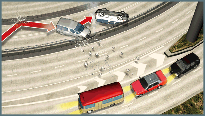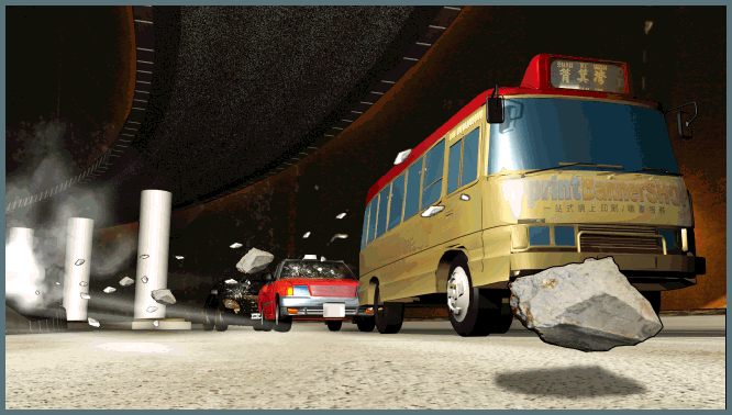 被七人車猛撼之快線其中一段約4米長及半米高石壆,在隆然一聲巨響下爆開粉碎,鋼筋外露石壆上一支燈柱塌下,數以百計石屎如炮彈碎片射向對面行車線,部份石屎塊長半米、重逾百公斤跌落在路中心。碎石四射之際,三部車輛包括紅色小巴、的士及私家車,剛從10餘米外民吉街東行線駛出,正好進入「射程範圍」結果全部「中彈」。