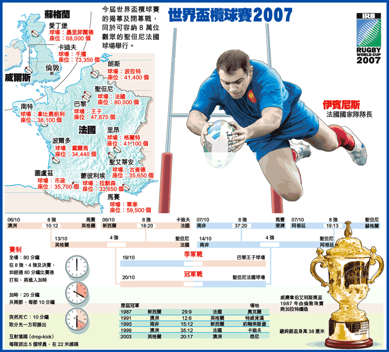 糾纏不清的歷史轇轕,加上4年前的一箭之仇,令到今屆世界盃欖球賽準決賽的英、法大戰更添火藥味!要成功報卻上屆被淘汰的恥辱,法國隊的戰術很簡單,先是全面封殺「英國紳士」韋健遜,再期望後備巨人查保發揮「野人」的侵略性,直搗英軍心臟!(有線63台明日2:45am直播)