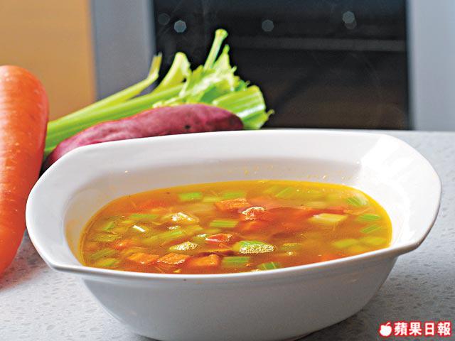 橙色甘笋有胡蘿蔔素,又補眼;綠色西芹可降血壓;紅色紅薯有澱粉質又飽肚,一個湯已帶給大家很多色彩與營養,若每餐需5色均衡,這個湯應該幾幫得手。