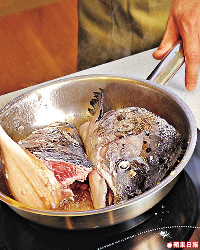 1.魚頭洗淨開邊,以鹽略醃,撲上少許粟粉後,將兩面煎香。