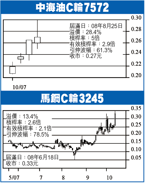 ■中海油C輪7572上周五收0.27元,升0.005元,成交209球。此輪08年8月25日到期,行使價14.68元,溢價28.4%,槓桿率5倍,有效2.9倍,引伸波幅61.3%,街貨19.8%。正股見15元,此輪理論價0.359元,升33%。