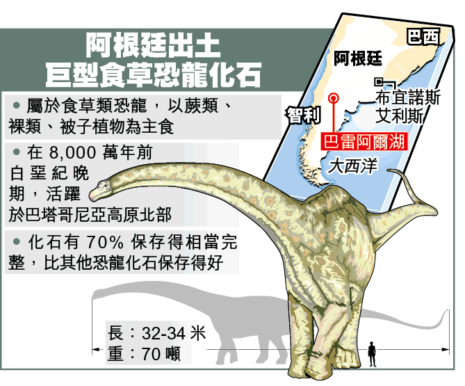 嘩,嘩,真是很巨型啊。阿根廷和巴西古生物學家發掘出全新品種素食恐龍的化石,估計牠在生時從頭到尾長32至34米,有四層樓高,是世上三種體型最龐大恐龍之一。若我國際電車男有機會站在牠面前,只會像老鼠般大,牠一腳就可把我踏死了。
