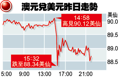 澳元在昨午約3時(本港時間.下同)左右攀上90.12美仙的全日高位,較周一收市升0.24美仙;但其後形勢突急轉直下,於下午3時半滑落至88.34美仙,即是在半小時內跌去1.78美仙。其間澳元兌日圓交叉盤滑落2.74日圓,挫至103.01,凸顯套息拆倉的威力。