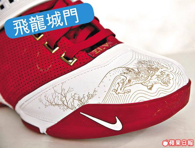 07NBA中國賽,騎士與魔術選擇在上海和澳門上演季前熱身。兩日前上海站一役中,大帝LeBronJames穿上的,正是這對最新紅白ZoomLeBronV中國限定版。其實為大帝專用鞋出中國版這伎倆,早於兩年前開始。第3代時有印上巨龍圖案的金色絲質鞋盒,第4代用上紫禁城大門作設計的木盒,今勻第5代延續紫禁城概念,加入中國城門上巨龍、飛簷樓角、行雲流水等的圖案。