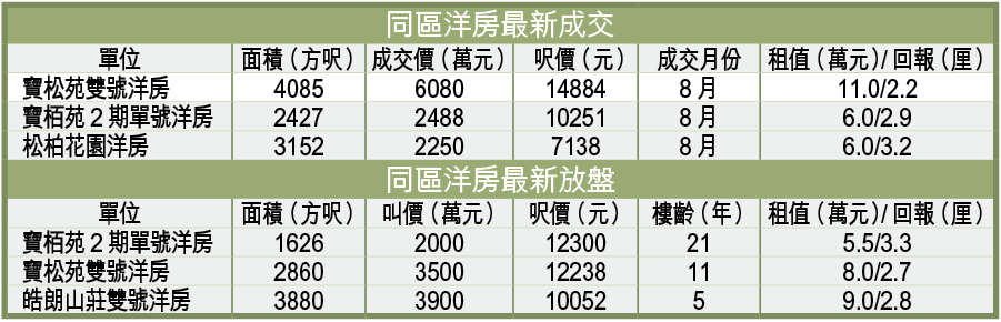 旭日國際主席蔡志明98年底向發展商購入寶松苑7座洋房,面積均為2860方呎,成交總額9009萬元。他一直持貨至今,全作出租,市場估計該批洋房已升值至少一倍。