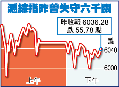【本報訊】面對當前熾熱的股市,內地官方兩大證券報章齊齊發表關注市場風險的評論文章,加上中國證監會主席尚福林及副主席屠光紹均提示市場風險,令市場擔憂或有新調控措施出台,令滬深股市借勢回調。A股最多曾跌約2%,幸低位獲投資者重新入場掃貨,滬綜指埋單收報6036.28,跌0.92%,深綜指亦跌0.45%至1533.27。