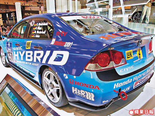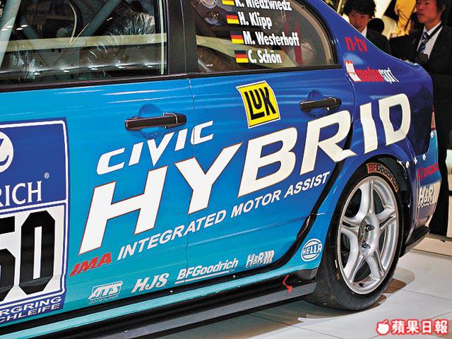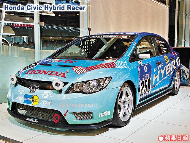 曾用作參加6月一場紐布靈24小時耐力賽的Hybrid混能戰車,便是眼前這部HondaCivicHybridRacer;論外觀,它跟普通的街道用版本大致相同,但細看下不難察覺廠方為其加裝了包圍,還有符合參賽資格的車內防滾架。機械配搭則是原來的1.4公升引擎加交流電馬達,在廠方的精心調校下,性能表現定比普通的強得多。