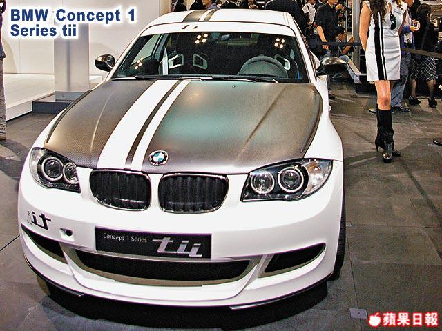 全新BMW1系登場後即惹來全球車迷注視,今趟廠方又在會場內展出名為Concept1Seriestii的版本,主要改變是外觀用上炭黑色18吋跑車合金胎軨、碳纖尾翼和賽車貼紙等等,驟眼看來要變得更具跑車氣息。