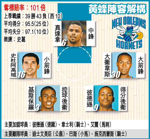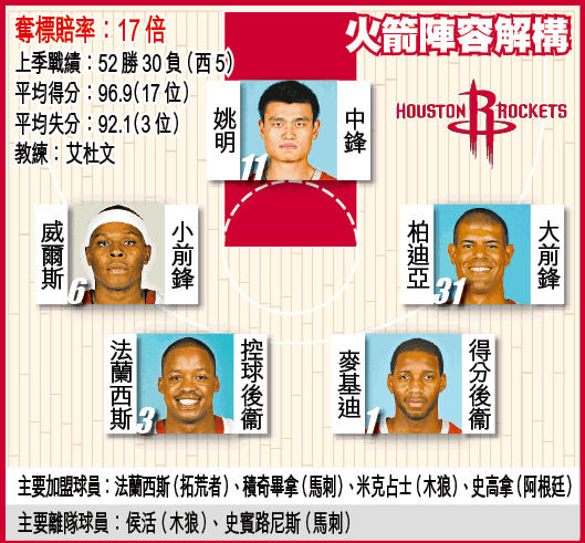至於剛剛在休季期間與葉莉「小登科」的姚明,在02年成為亞洲首位NBA「狀元」加盟火箭後,會方即以今季回歸火箭的法蘭西斯與之夥拍打造「新火箭」,可惜效果並不理想下,以後者作交易籌碼換來魔術的麥基廸,組成「姚麥配」;然而由於兩人交替因傷缺陣,致使火箭依然未能升空,但姚明已開始取代年邁的奧尼爾,成為聯盟的首席中鋒。灰熊的「西班牙長人」加素雖然仍未能帶領球隊躋身季後賽,但他在今夏領國家隊在世錦賽上封王,足以證明他乃大將之材,目前只是欠缺支援而已。