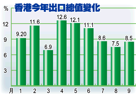 【本報訊】本港9月份整體出口增長8.5%,較8月份回升1個百分點,當中受次按影響較大的美國和英國出口市場,均出現跌幅。有經濟分析師指,表現為預期之內,第四季可望保持溫和單位數字增長。
