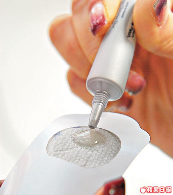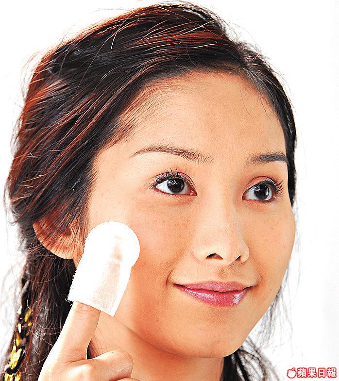 撕開包裝紙,取出按摩指套,將指套套在食指上,指套中已沾有精華素,只須輕輕地均勻塗抹全面、鼻側及頸部等部位,便有美白效果。