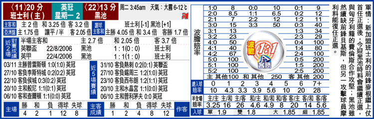 班士利今季聯賽主場共取得4勝2和1負,加上新加盟的前鋒麥根表現對辦,周一迎戰黑池時料會繼續正選,夥拍匈牙利的費倫斯攻堅,故難免會被看高一線。不過,該隊要讓一球就似乎太多,畢竟班士利人腳與實力並非高黑池太多,而今季聯賽亦未嘗讓對手一球,加上近況平平,對上5場只得1勝2和2負,而近3次與黑池交手都打和,今役實在不宜高估。