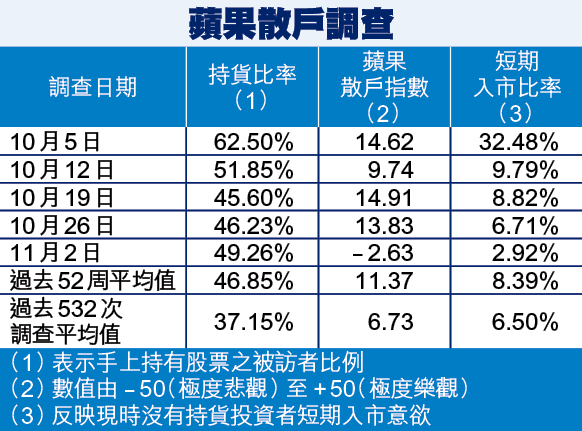 蘋果散戶調查指數顯示,上周持貨的散戶微升3.03個百分點至49.26%;但看好後市人數比例則大跌16.46點,至-2.63點,是近期少見的負點數;短期入市的投資者亦下跌3.79個百分點至2.92%,反映散戶對後市持觀望態度。