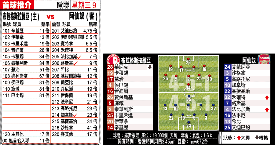 越戰越勇的阿仙奴,在周三的歐聯H組分組賽,只要擊敗主場的布拉格斯拉維亞,就可穩奪出線權,加上他們在上仗又曾大數斯拉維亞7:0,阿仙奴[-1],當取「客勝」。(球賽編號:星期三9;now672台明日3:45am直播)吾中