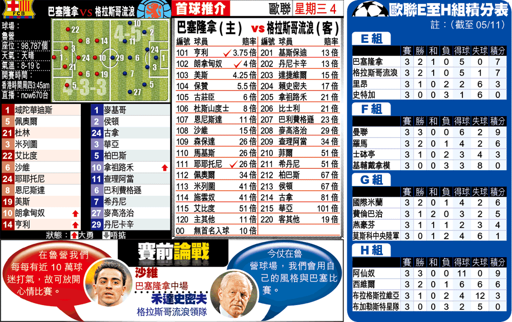 巴塞兩星期前作客格流,由於對手大踢消極足球,屯重兵於後防,加上他們自己未能百分百發揮出水準,結果打和0:0完場。今於福地魯營球場與格流進行第4輪分組賽,相信他們不會再令支持者失望,因今屆他們於主場比賽,7戰全勝,其中有6場是淨贏兩球或以上,遠比在客場取得2勝4和1負好。