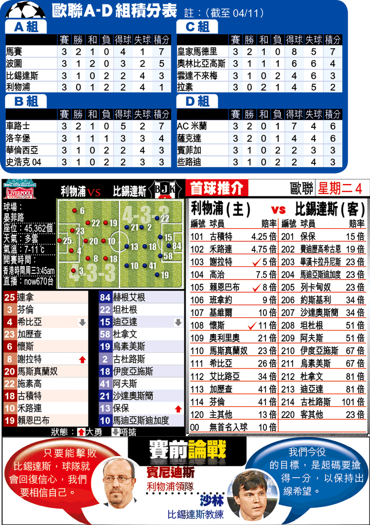 不過,周二之役已是今季第4輪歐聯分組賽,若利物浦要保住出線希望,今仗就不容有失,而在近屆,利物浦就不時於歐聯發揮「小宇宙」,例如在04年12月非勝不可的分組賽,落後下反勝奧林比亞高斯,以及於05年5月的決賽,落後3球下迫和AC米蘭,最後互射12碼勝出,捧盃而回;故相信紅軍不會因沉重壓力而表現失準。