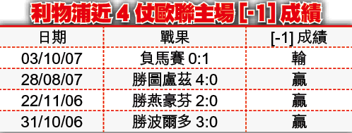 另外,利物浦在歐聯第4輪分組賽表現特佳,全部勝出,而在歐聯主場[-1]的盤路亦好,近4次[-1]有3次贏盤(見附表)。再者,利物浦可披甲球員中,仍不乏質高球員,如中場謝拉特、重炮手懷斯及助攻助守的馬斯真蘭奴等。