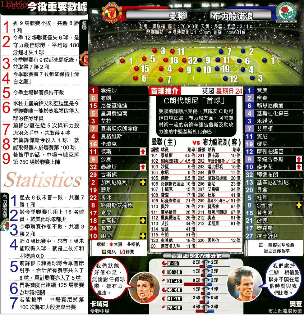 曼聯今季表現慢熱,直到上月初才真正上力,對上6仗有5次攻入對手4球,其中攻擊鐵三角基斯坦奴朗拿度、朗尼及泰維斯更頻有入球,合共入了20球。他們是役雖有朗尼及史高斯避戰,但早前重創的中場夏格維斯及卡域克先後復出,加上兩新兵拿尼及路爾斯安達臣亦開始融入球隊,故今被看高一線,表面上是合情合理。
