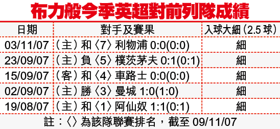 布力般之級數肯定在曼聯之下,但今季他們與聯賽前列球隊交手,取得1勝3和1負(見附表),足證份量十足,加上近況好,對上8仗錄得7勝1和,今鬥曼聯只要踢出水準及部署,有力取得分數而回。考慮到他們與前列隊比賽,全開總入球兩球或以下,可吼兩倍的入球「細」,並取「讓球主客和」[+1]的「客勝」。