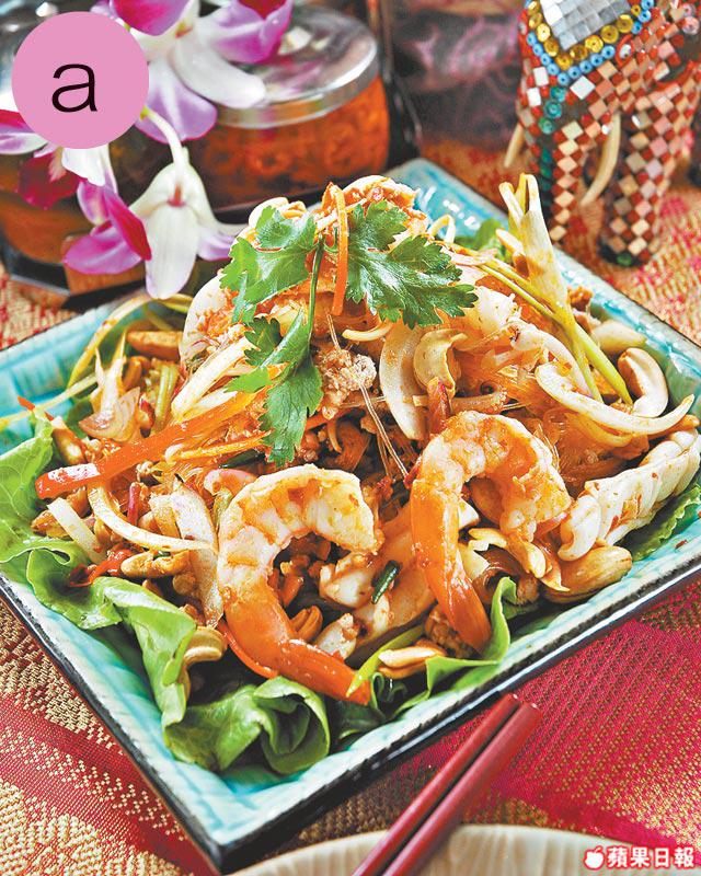 將煮熟的海鮮、腰果及洋葱等,加入自製的酸辣汁拌勻。味道不太酸,海鮮味道鮮甜。而碟底的粉絲,凍冰冰,夠晒彈牙。