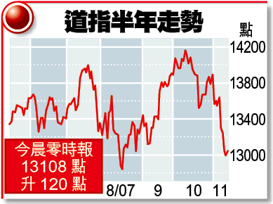 道指最多升144點或1.11%,見13132點,扭轉之前四日的跌勢;納斯達克綜合指數曾漲41點或1.46%,至2625點。開市後個半小時(本港時間今晨零時),道指升120點,報13108點;納指升37點,報2621點。