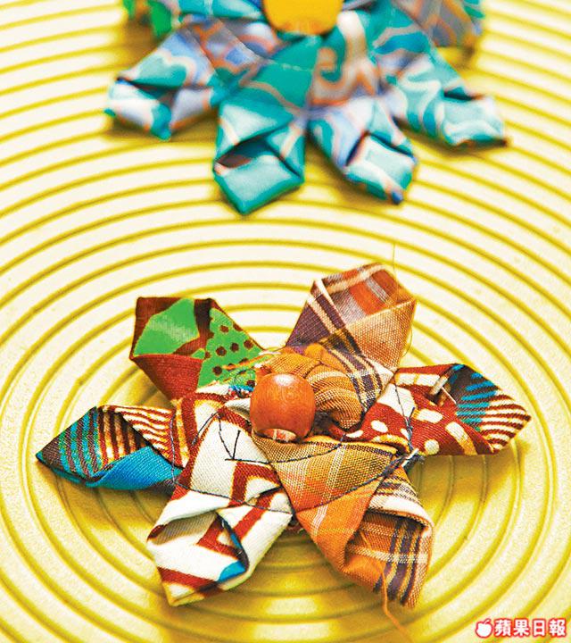 用不同的拼布縫合,變成一朵朵襟花,用作衫、裙、袋的裝飾,亦可加絲帶變成頸鏈,變化多端。