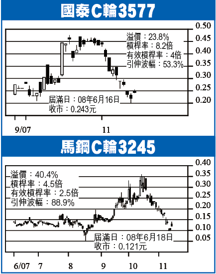 ■國泰C輪3577收0.243元,升0.023元,成交2.8球。此輪08年6月16日期滿,行使價22.08元,溢價23.8%。槓桿率8.2倍,有效4倍,引伸波幅53.3%,街貨6.3%。正股見22元,此輪數據最佳,理論價0.362元,升49%。
