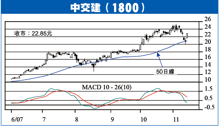 中國交通建設(1800)昨收22.85元,升9.5%,股價早前表現強勢,但近日港股跌勢轉急,中交建亦反覆下試50日線,前天在50日線現「十字星」並配合大成交,昨天裂口炒上,短線反彈已開展,升破23.2元,可向25元推進。短線炒賣,可以21元作止蝕位,股價上破25元看27元,亦可考慮以C輪2295入市,昨收36.5仙,溢價2.9%,有效槓桿4.8倍。