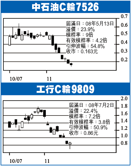 ■中石油C輪7526收0.163元,跌0.017元,成交4365球。此輪08年5月13日期滿,行使價16.58元,溢價23.9%,槓桿率9倍,有效4.2倍,引伸波幅54.8%,街貨65.8%。正股見18元,此輪理論價達0.352元,升116%。