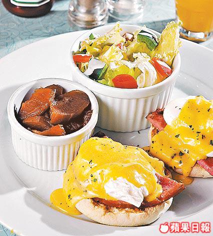 鬆餅上放煎過的火腿,淋上蛋香四溢的芝士蛋汁,一口咬下,蛋黃汁會流出,味道一流。
