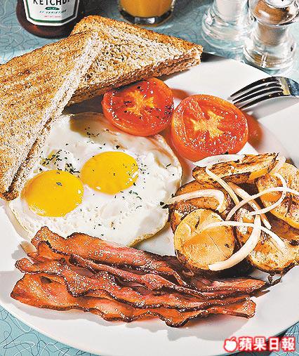 最傳統的美式早餐,有雙蛋、小麥多士、煙肉條、薯仔及番茄等。煙肉煎至脆卜卜,雙蛋較英式為熟。
