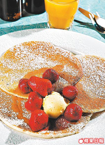 鬆軟的Pancake,鋪上新鮮士多啤梨。喜歡酥香的可以淋肉桂醬,若要甜的話可考慮藍莓醬。