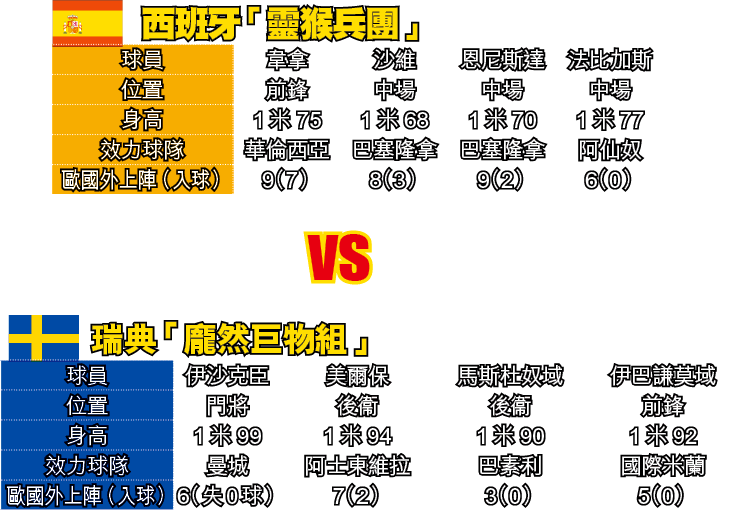 周末歐國盃外圍賽F組榜首大戰,只要贏波即可出線的主隊西班牙,陣中成員每多矮仔;相反不敗便可晉級的客軍瑞典,個個神高神大。此回剛柔對碰,儼如「孫悟空大戰金剛」,好睇過戲!文:牽牛