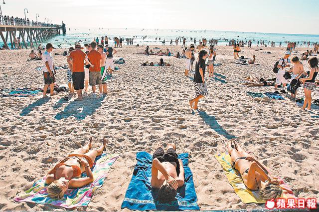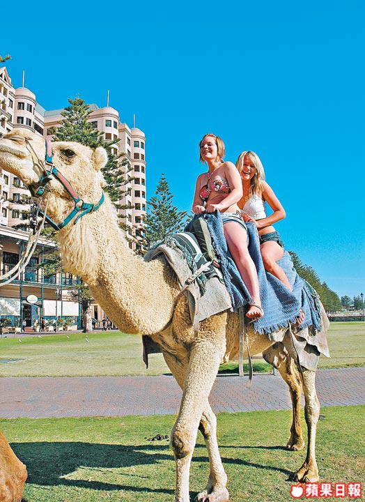 其實兩個星期以來,我問過的每一個年輕的澳洲人,周六、日喜歡到那裏去。十個有七個,包括SuperHumanJoshua都答要去BeachSideGlenelg。官方發佈,乘$30電車,花約20分鐘就可由市中心來到西邊的Glenelg沙灘。然而星期六陽光普照,電車沿路站站停,兼有好多着住泳衣的少女陸續上車,這一程,我花了50分鐘。未見到沙灘,但廣場上高矮肥瘦都全線換上三點式跟滑浪褲等車周街走,落到沙灘,嘩!不得了!過了兩星期寧靜生活的筆者,從沒想過阿得萊德有如此多年輕人口,把沙灘塞得滿滿的。打排球的、騎駱駝的、滑浪的,忙個不亦樂乎。
