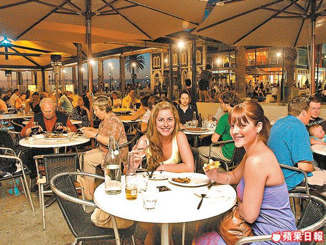 餓了,折返Glenelg的電車站,沿着整條JettyRoad都是各式的餐廳跟酒吧,不過那些澳洲人最愛的露天座椅,永遠都塞滿人,相信是Glenelg最有氣氛的夜!面對電車站人氣最盛的有意大利餐廳EuropaattheBay,灑在薄餅上頭的煙肉都烤得香脆,而且夠便宜,只需$71起,所以極受歡迎。往遊艇碼頭那邊走,向海的Sammy'sontheMarina最出名吃澳洲人最愛的炸魚薯條,而且用的是南澳洲才有的KingWhiteFish。炸得不油膩而仍保有魚香,只是價錢異常地貴,不過其Size之巨絕可餵飽兩個餓鬼。