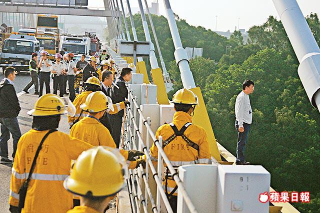 警方封鎖現場慢線及橋下部份航道,與消防合力游說事主,未幾三男一女談判專家趕至努力勸說。其間橋面不時吹起陣陣強風,將事主吹至搖搖欲墜,險象環生。