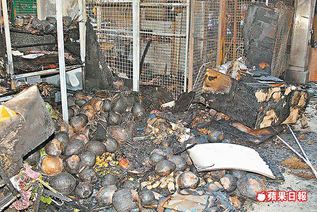 【本報訊】油麻地新填地街一列牌檔三個月前發生離奇火警後,昨清晨又再度被人縱火,17個牌檔被焚毀,幸無人受傷。其中一間經營中式嫁娶用品的譚財記,多個被人訂購過大禮用的椰子在火警中被「燒燶」,女檔主激動哭訴:「好凄凉,燒完一次又一次!」猶幸得供應商幫忙,通宵趕製交貨。警方對牌檔接二連三被縱火高度重視,初步不涉勒索,但動機仍待調查,油尖警區重案組已接手跟進。 記者:黎志偉 宋光明 梁澤岡