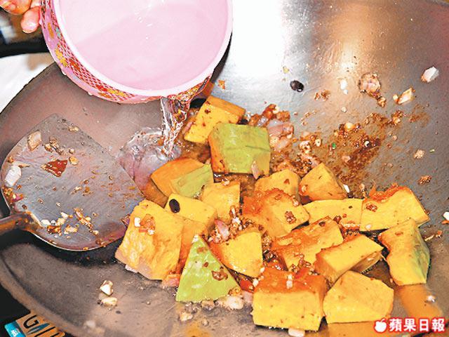 2.之後將南瓜件及1/2杯清水倒入鑊後煮至熟。
