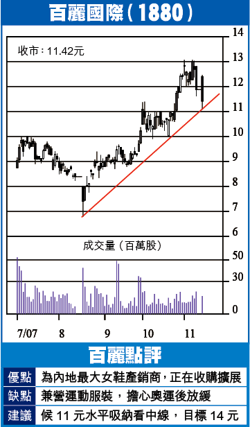 百麗於5月上市,至今已進行第三宗收購,包括8月以3.74憶元收購Fila品牌在中港澳的商標權,10月以6億元收購妙麗鞋品商標及分銷業務,連同收購森達,共耗資26億元之譜,上市集資80億元,有關資金正在運用中。