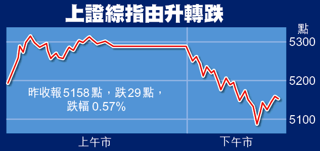【本報訊】內地10月份通脹升6.5%,回升至8月份的10年來歷史高位,較市場預期的6.4%略高。經濟師普遍相信,本月及下月通脹仍然高企,中央將繼續有宏調措施出台。市場憂慮人行最快周末再度加息下,午後銀行股全線轉弱,A股倒跌收場,並連跌第四日,滬綜指收報5158點跌0.57%,深綜指則跌0.5%至1271點。 記者:黃武榮、周燕芬