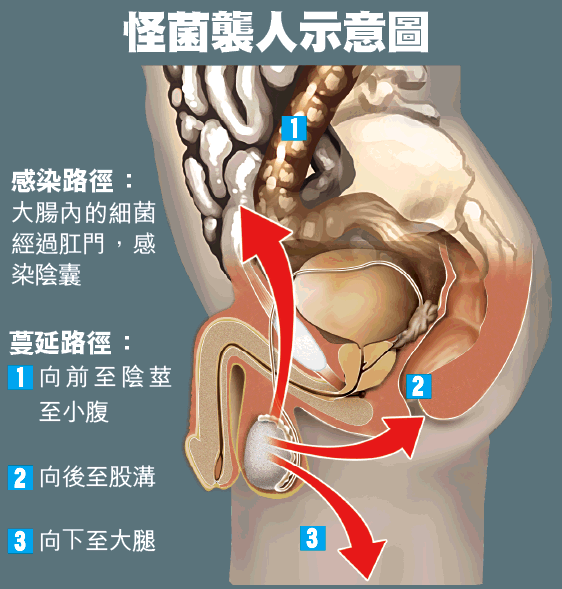 【本報訊】瑪麗醫院過去五年接獲18宗「福耳尼埃氏壞疽」(Fournier'sgangrene)個案,有6人死亡。患者大腸內的惡菌透過肛門蛀食鄰近皮膚組織,最快可於半天內致陰囊及下體壞死,最年輕個案為26歲的健康男子。有泌尿科醫生警告,這種患者以男性為主的其中一種壞死性筋膜炎,可在數天內導致細菌入血奪命,曾有個案須切除壞死的陰囊及陰莖保命。記者:白琳、張嘉雯