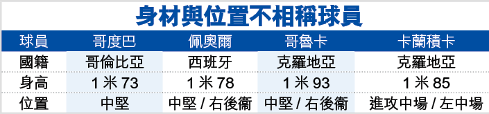 在足球世界,除了技術外,身材亦決定球員位置的重要因素,一般中堅要應付對方高空轟炸,多以高佬出任;相反左右二閘需要靈巧及變速,身材高大反而是阻礙,不過哥度巴、佩奧爾、哥魯卡等算是異數。