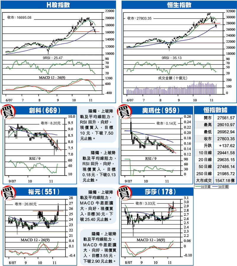 恒指日線圖呈陽燭,形態上類似錘頭,早段雖一度下破50日線支持,有幸的是迅速重回其上,有機會在現水平組織一次較大幅度的反彈,再定後向,只是淡勢已成,預期略為反彈過後,仍會向最小量度跌幅目標區25000進發。