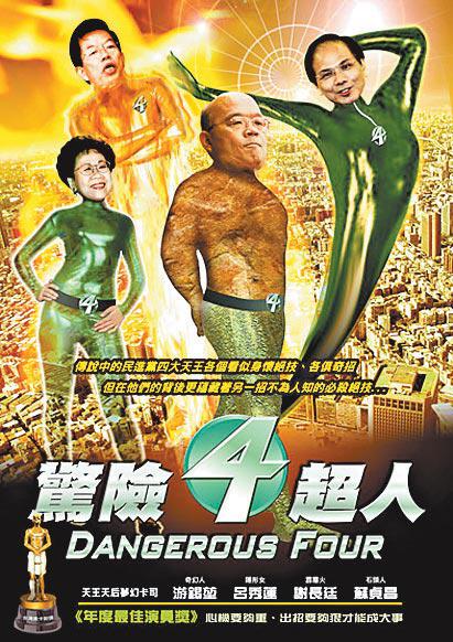 不過,論惡搞效果最出色的,還是要數揶揄民進黨四大天王的《驚險4超人》。副總統呂秀蓮、民進黨兩位正副總統候選人謝長廷、蘇貞昌,以及前黨主席游錫堃,四人同時涉嫌詐領特別費,但最後只得呂、游被起訴。難怪網站把他們的頭像,剪貼在《神奇四俠》(FantasticFour)海報上,卻出奇地合襯。